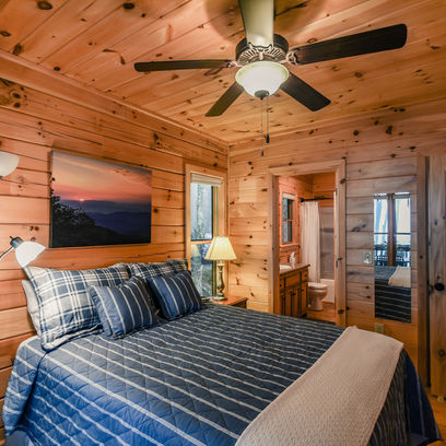 King bedroom has king bed, reading lamps, ceiling fan, walk-in closet and full bath with walk-in shower and toilet.